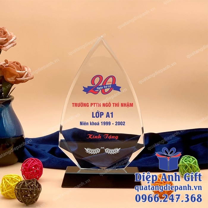 Kỷ niệm chương họp lớp mang ý nghĩa biểu tượng lâu dài, trường tồn. Được làm từ chất liệu pha lê, sang trọng, tinh tế, món quà sẽ giúp buổi họp lớp ý nghĩa, đáng nhớ hơn. Trên kỷ niệm chương bạn có thể in hình ảnh, logo, tên trường, lớp, niên khóa,…. Để mỗi khi nhìn vào, món quà lại gợi nhắc chúng ta về những kỷ niệm đẹp nhất thuở học trò. Đây là món quà rất được ưu chuộng, được lựa chọn nhiều nhất trong buổi họp mặt.