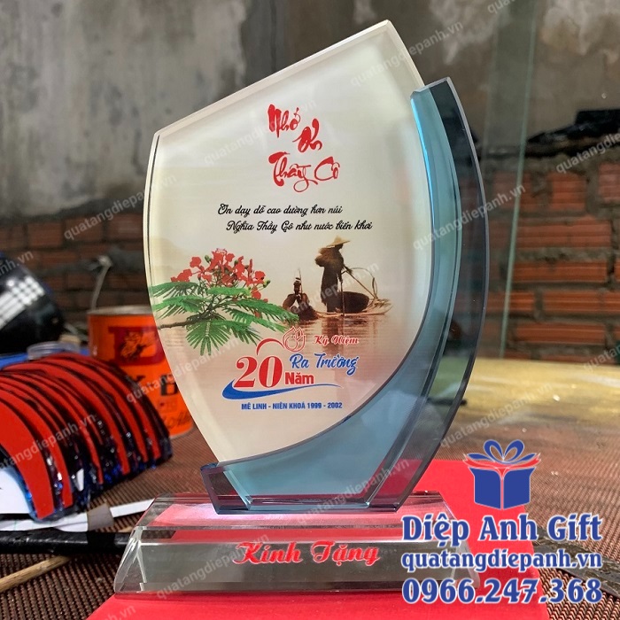 Kỷ niệm chương họp lớp mang ý nghĩa biểu tượng lâu dài, trường tồn. Được làm từ chất liệu pha lê, sang trọng, tinh tế, món quà sẽ giúp buổi họp lớp ý nghĩa, đáng nhớ hơn. Trên kỷ niệm chương bạn có thể in hình ảnh, logo, tên trường, lớp, niên khóa,…. Để mỗi khi nhìn vào, món quà lại gợi nhắc chúng ta về những kỷ niệm đẹp nhất thuở học trò. Đây là món quà rất được ưu chuộng, được lựa chọn nhiều nhất trong buổi họp mặt.