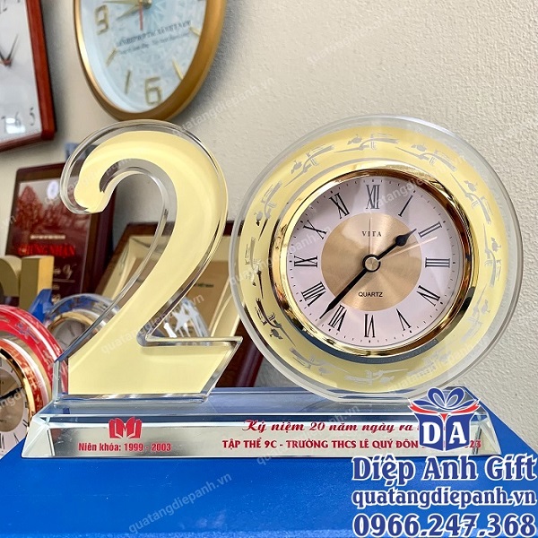 Kỷ niệm chương họp lớp mang ý nghĩa biểu tượng lâu dài, trường tồn. Được làm từ chất liệu pha lê, sang trọng, tinh tế, món quà sẽ giúp buổi họp lớp ý nghĩa, đáng nhớ hơn. Trên kỷ niệm chương bạn có thể in hình ảnh, logo, tên trường, lớp, niên khóa,…. Để mỗi khi nhìn vào, món quà lại gợi nhắc chúng ta về những kỷ niệm đẹp nhất thuở học trò. Đây là món quà rất được ưu chuộng, được lựa chọn nhiều nhất trong buổi họp mặt.