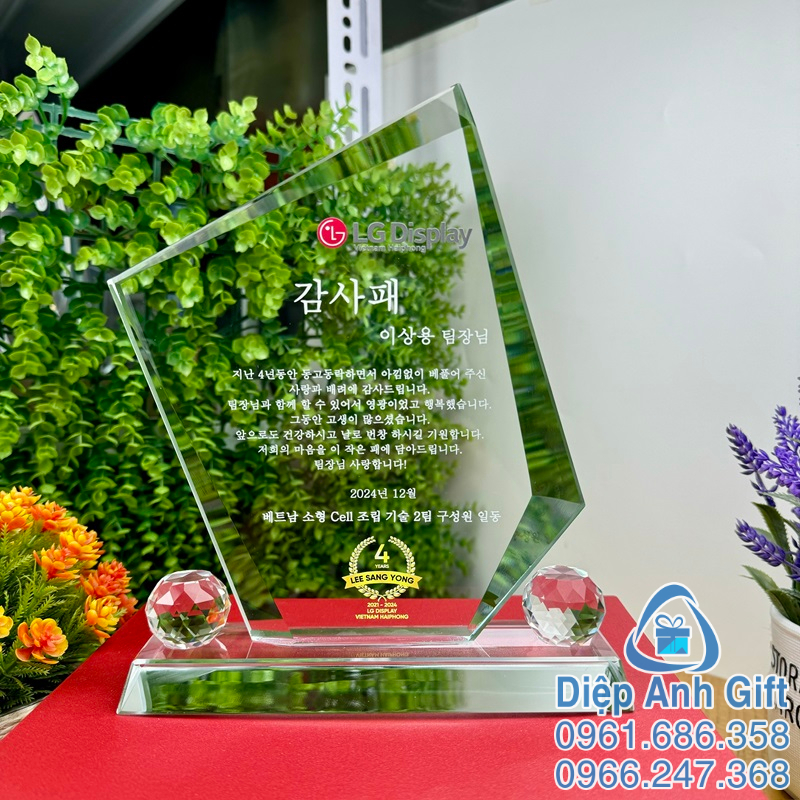 Món quà được làm từ chất liệu pha lê, vô cùng tinh tế, gửi gắm những ý nghĩa lớn lao dành cho người được tặng