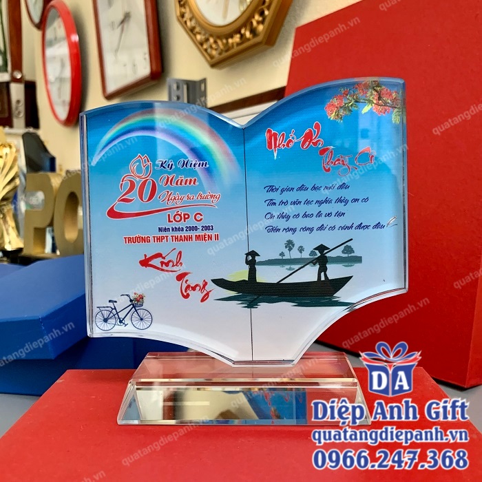Kỷ niệm chương họp lớp mang ý nghĩa biểu tượng lâu dài, trường tồn. Được làm từ chất liệu pha lê, sang trọng, tinh tế, món quà sẽ giúp buổi họp lớp ý nghĩa, đáng nhớ hơn. Trên kỷ niệm chương bạn có thể in hình ảnh, logo, tên trường, lớp, niên khóa,…. Để mỗi khi nhìn vào, món quà lại gợi nhắc chúng ta về những kỷ niệm đẹp nhất thuở học trò. Đây là món quà rất được ưu chuộng, được lựa chọn nhiều nhất trong buổi họp mặt.