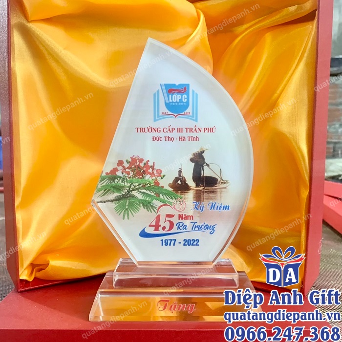 Kỷ niệm chương họp lớp mang ý nghĩa biểu tượng lâu dài, trường tồn. Được làm từ chất liệu pha lê, sang trọng, tinh tế, món quà sẽ giúp buổi họp lớp ý nghĩa, đáng nhớ hơn. Trên kỷ niệm chương bạn có thể in hình ảnh, logo, tên trường, lớp, niên khóa,…. Để mỗi khi nhìn vào, món quà lại gợi nhắc chúng ta về những kỷ niệm đẹp nhất thuở học trò. Đây là món quà rất được ưu chuộng, được lựa chọn nhiều nhất trong buổi họp mặt.